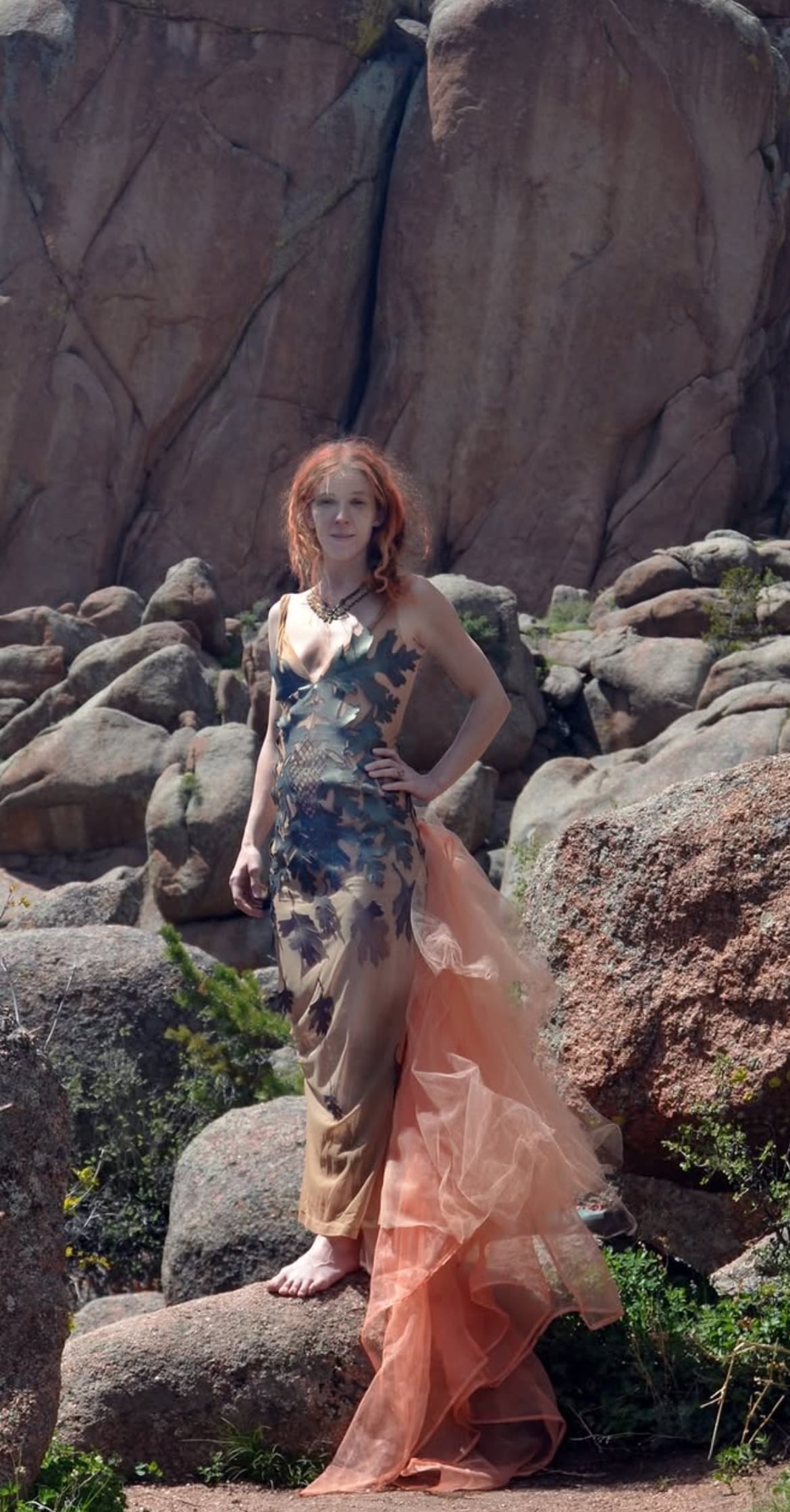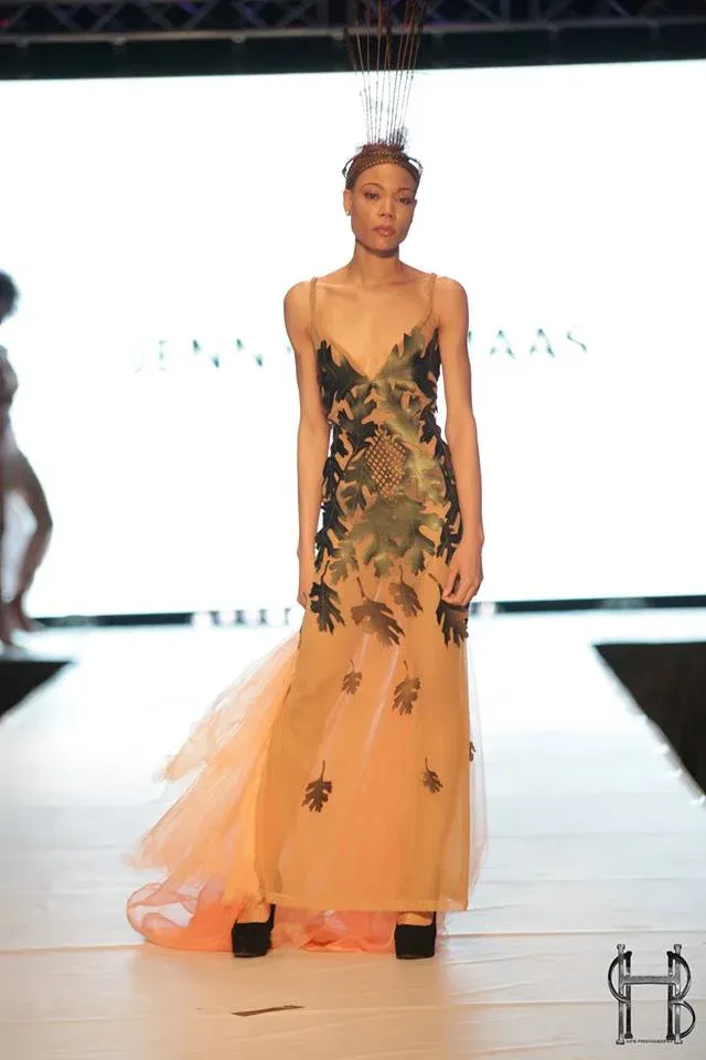 J.L.Maas Leaf Gown on the runway at Philly Fashion Week | Jenny wearing a Leaf Gown in the wild on a road trip adventure in Vedavoo