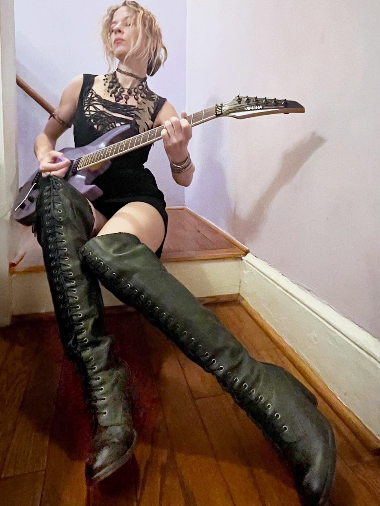 And, you know, when I put together a good outfit I sometimes do a photo shoot (by me) to document it & make some promo pics. I added the leaves to my guitar strap, I made them by hand. I once made a series of leaf gowns and these were leftover leaves from the gowns that I made. Since I like making things I have been toying with the idea of making some limited guitar straps to make as merch to help fund the studio & project goals. So, as always, stay tuned!