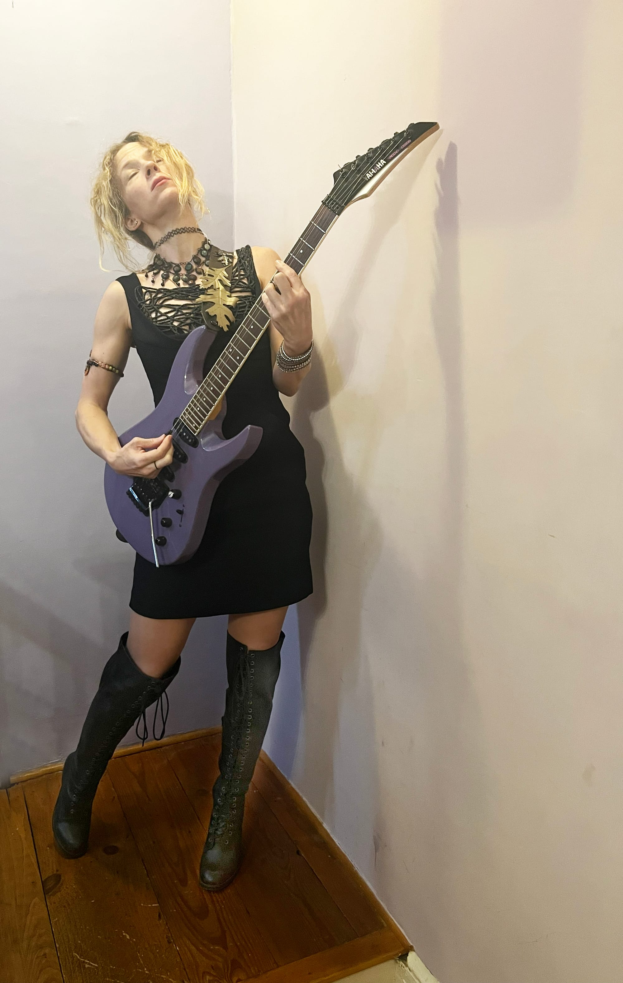 Jenny making a fit doc photo shoot | styled by her with a custom leaf guitar strap that she made